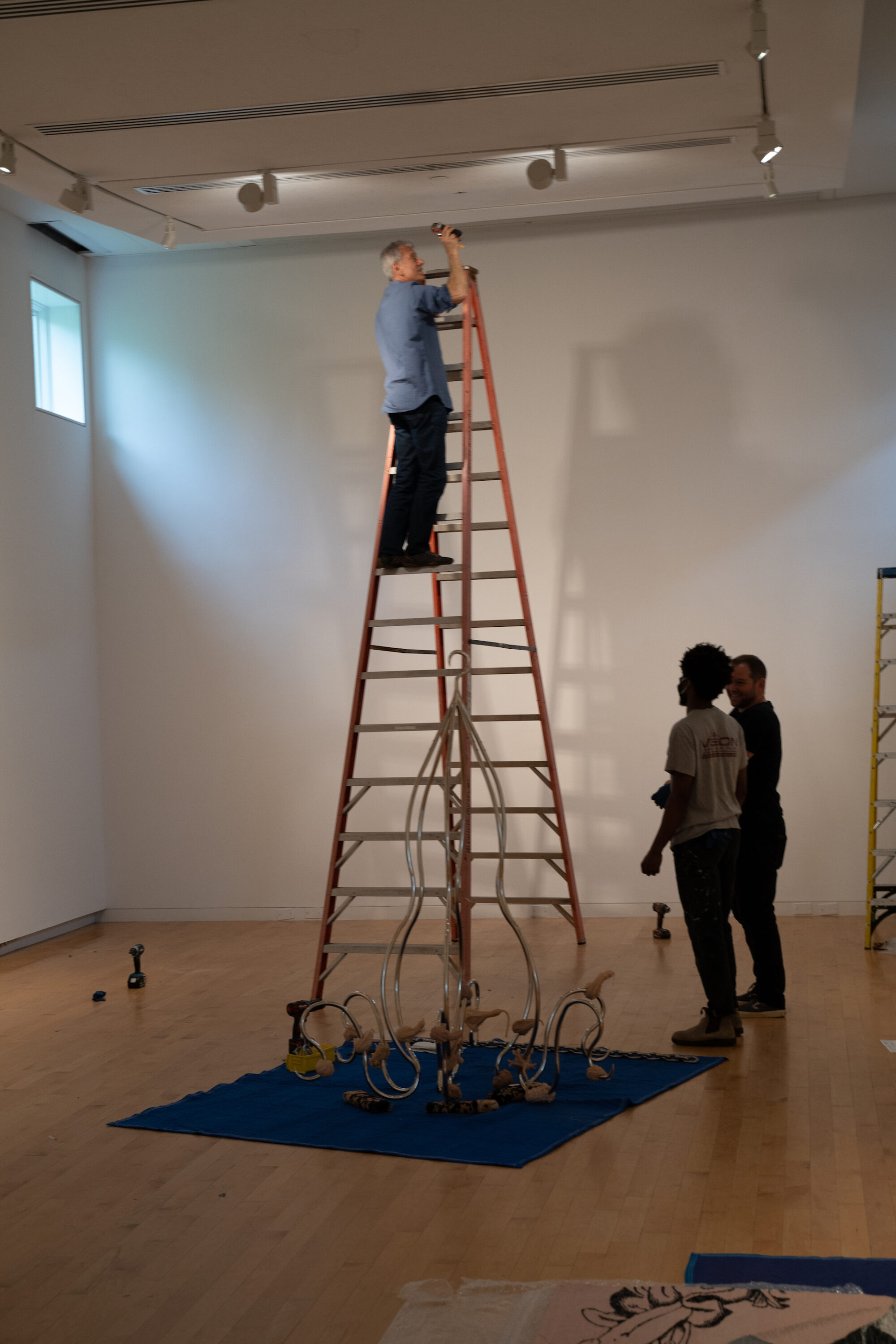 One of the most interesting installations to watch were Reeva Potoff’s scrolls. There were about five to ten different people all crammed into one room, helping assemble Reeva’s ten-foot high scrolls on these long carabiners that hung from the ceiling. This required some very high ladders, a scissor lift, a bunch of hands, and of course Reeva’s creative direction. This process was incredibly delicate, requiring everyone to take their shoes off when the art was still laying on the floor in the hopes of not damaging the pieces. Gloria and I hugged a corner in the hopes of getting some good shots of the scene, which was in fact a success. The crew members brought up each scroll, extremely delicately of course, and hung them up one by one. Once they finished Reeva grinned with joy and the rest of the crew looked ready to get to business on the next task with the hard deadline of June 4th, the VIP opening of the exhibit.