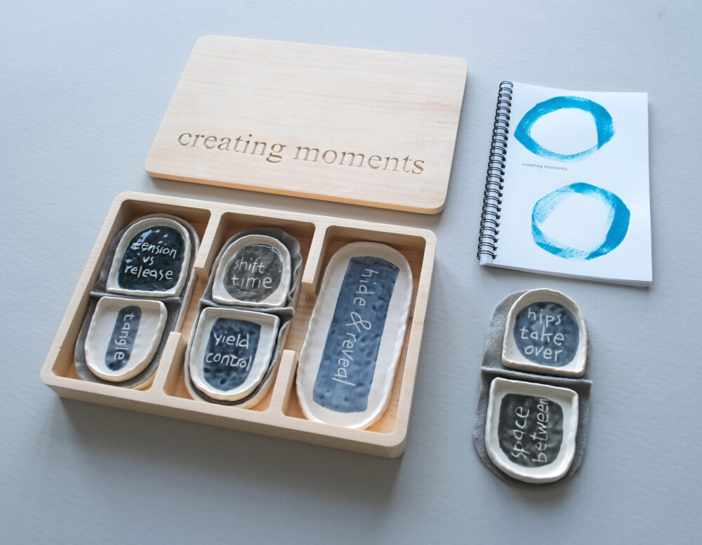 With creating moments, I have collaborated with artists Anna Highsmith (ceramic trays), Cyrus Highsmith (lettering), Sam Brodsky (wooden boxes), and MorganEve Swain (music) on an interactive movement exploration. In this work, we offer you the space to explore your own movement impulses and movement vocabulary. We created a framework with prompts that will get you started, but these are just suggestions. Feel free to follow your desires to create your own movement story. You can interpret these prompts however it makes sense for you. Whether the way you move is swimming or walking or playing sports or dancing, I hope you feel comfortable to take your personal embodied experience, trust it, and interpret these prompts in the way that makes the most sense for you.